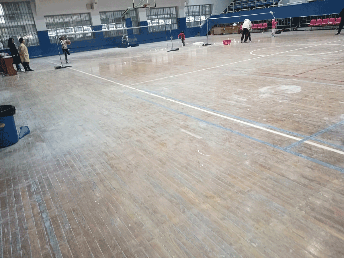 1、籃球館運動木地板表面有不少難以去除的頑固污漬,不僅影響了木地板表面的防滑摩擦系數(shù),還影響了木地板的整體美觀度;