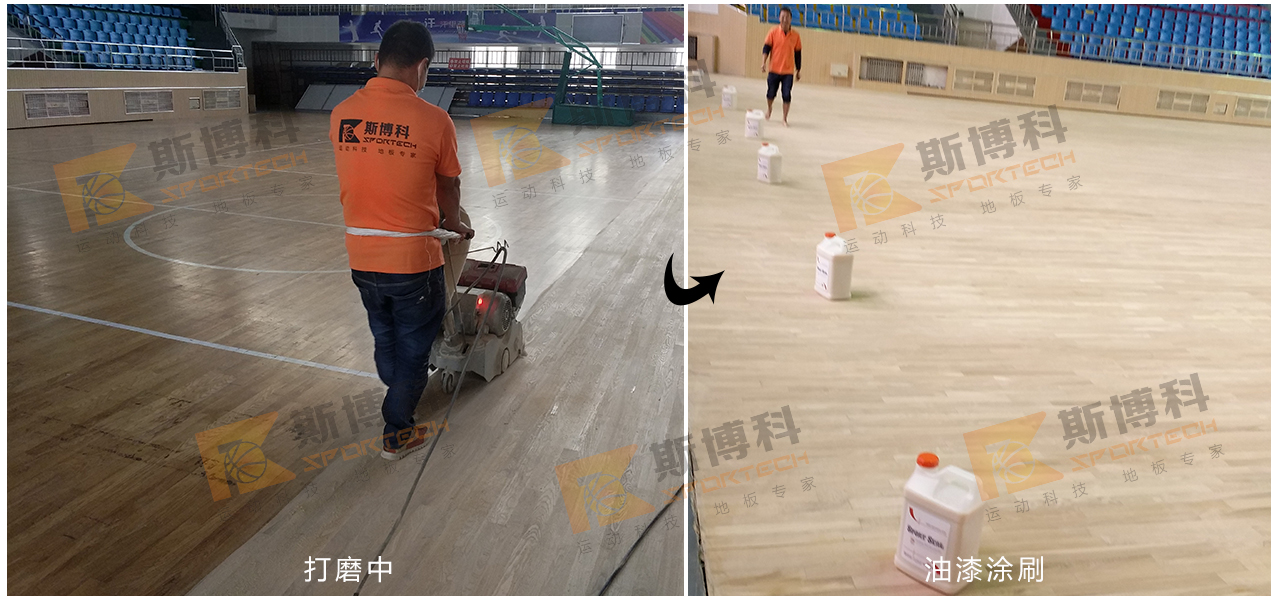我司查看場館具體情況之后開始施工:場館由進口打磨機整體打磨; 然后磨掉舊漆面和地板上的劃痕,并對裂縫處進行補膩子填縫處理;之后上涂NBA場館運動木地板指定專用底漆(Sportseal)。最后由我司免費測量為場館制定畫線,最后再上斯博科(Sportkote)專用面漆。完工后效果煥然一新。高效,專業(yè),客戶對此表示非常滿意。