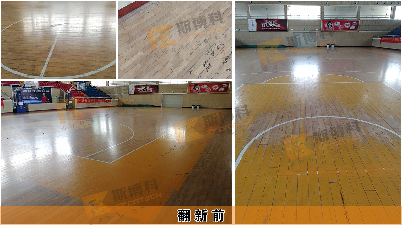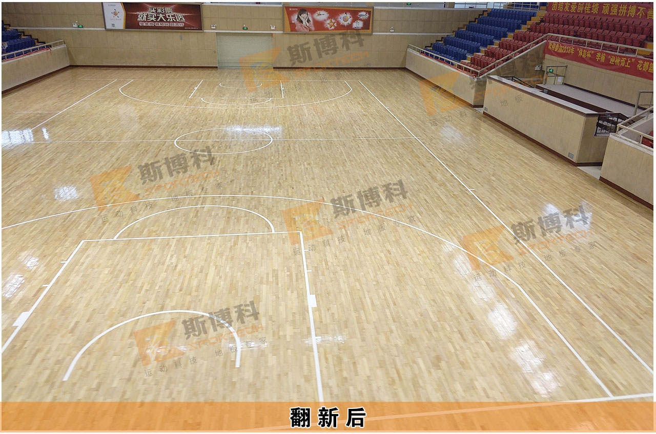 對老舊破損的花都體育館地板進行徹底打磨翻新,去除舊漆面及板面劃痕,重新涂刷四遍SPORTKOTE 美國進口水性專業(yè)運動地板漆,全面恢復地板運動性能和漆面的光亮防滑效果,翻舊勝新。