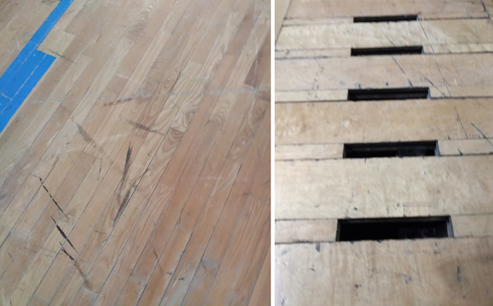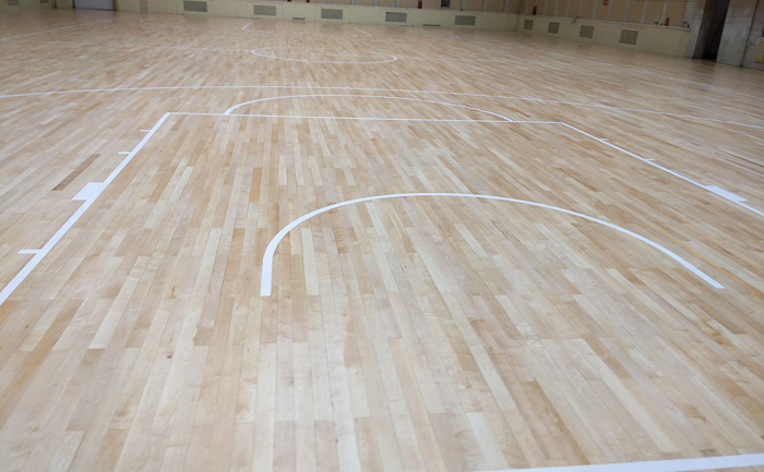 銀川湖濱體育館已經(jīng)使用5年之久,賽事活動很多,長時間的運(yùn)營,致使體育場館的木地板表面漆膜磨損嚴(yán)重,劃痕明顯,運(yùn)動木地板表面還附著垃圾黑點(diǎn),失去了原有的光澤和感光性,跟客戶交談所知,場館投入使用以來,只是每隔一段時間對木地板做過簡單的清潔處理。