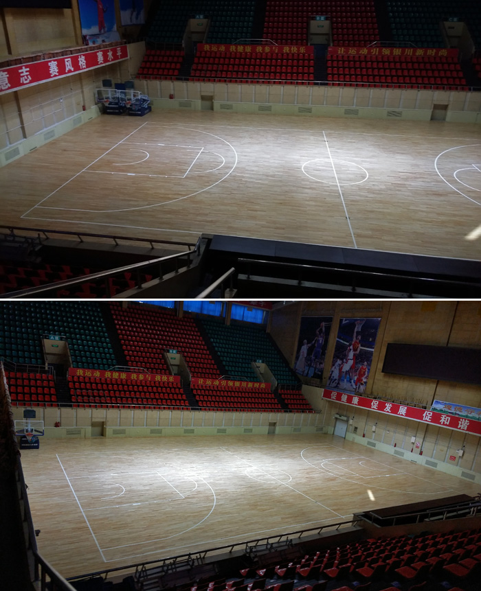 銀川湖濱體育館木地板翻新工程是由深圳斯博科體育實(shí)業(yè)有限公司于2017年11月承接,翻新面積1000余平米,從進(jìn)場打磨修補(bǔ)上漆劃線全部完成施工耗時僅4天,比國內(nèi)其他方法施工時間節(jié)約60%”.現(xiàn)已驗(yàn)收合格投入正常使用,翻新效果超過客戶所想,翻舊“超新”