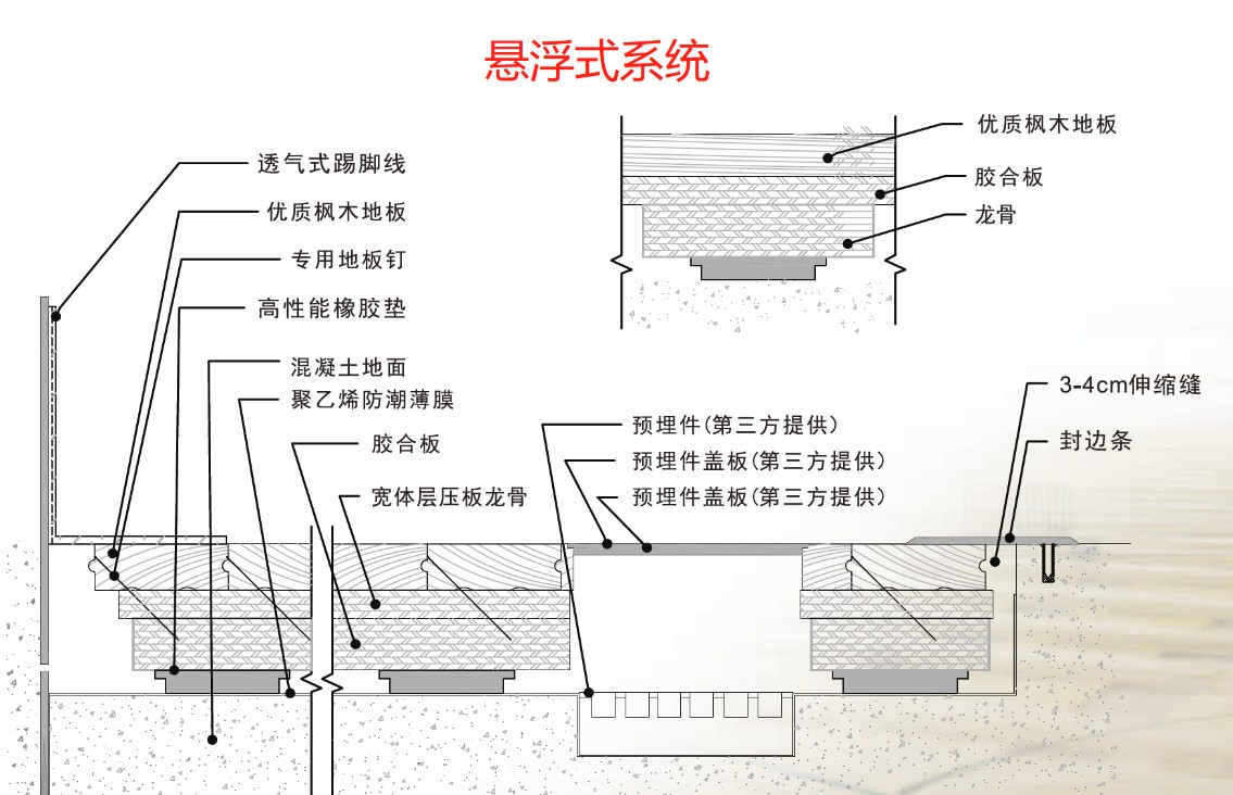 專業(yè)運動木地板一般由漆面、面板、層板、龍骨、彈性墊組成,其中層板、龍骨及彈性墊統(tǒng)稱為底部結(jié)構(gòu)。按照底部結(jié)構(gòu)的鋪裝方式和固定形式,可將運動木地板分為懸浮式系統(tǒng)、固定懸浮式系統(tǒng)和拆裝式系統(tǒng)。目前市面上基本每個品牌廠家,都有不同結(jié)構(gòu)的運動地板產(chǎn)品,不同的結(jié)構(gòu)設(shè)計,可以讓地板獲得不同的技術(shù)性能參數(shù),適合于不同的球類運動需要和不同場館的地面標(biāo)高需求。比如排球、羽毛球場地,球員彈跳頻繁,為保護(hù)運動員關(guān)節(jié)所受到的沖擊力,應(yīng)該選用沖擊吸收性能較好的懸浮式地板系統(tǒng);籃球館,球員需要地板具備最佳的球體反彈性能,則應(yīng)選用固定懸浮式的地板系統(tǒng);訓(xùn)練級別的場館,在滿足基本的六大運動性能指標(biāo)前提下,應(yīng)考慮采用沖擊吸收性能更加的地板,最大限度保護(hù)長期在館內(nèi)訓(xùn)練的球員免受運動損傷,延長運動壽命;競賽級別的場地,為減少運動過程中的能量損失,最大限度發(fā)揮運動員的競賽水平,,建議采用沖擊吸收及垂直變形較小的地板,這也是為什么