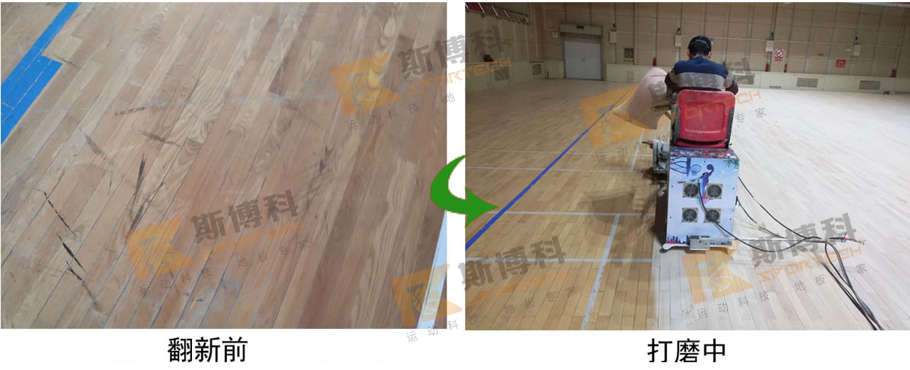 斯博科體育通過(guò)采用運(yùn)動(dòng)木地板整體打磨翻新方案,消除地板劃痕污損,重新涂刷油漆恢復(fù)地板漆面光亮防滑效果,滿足專業(yè)運(yùn)動(dòng)需求;整改木地板預(yù)留通風(fēng)口,消除通風(fēng)口間隙,避免雜物掉落。