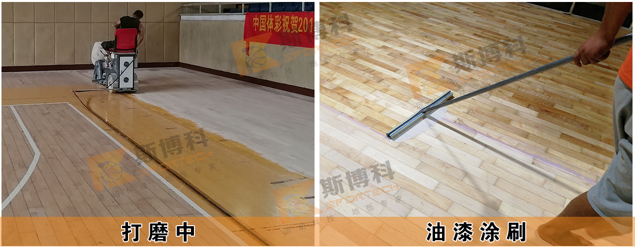 對老舊破損的花都體育館地板進行徹底打磨翻新,去除舊漆面及板面劃痕,重新涂刷四遍SPORTKOTE 美國進口水性專業(yè)運動地板漆,全面恢復地板運動性能和漆面的光亮防滑效果,翻舊勝新。