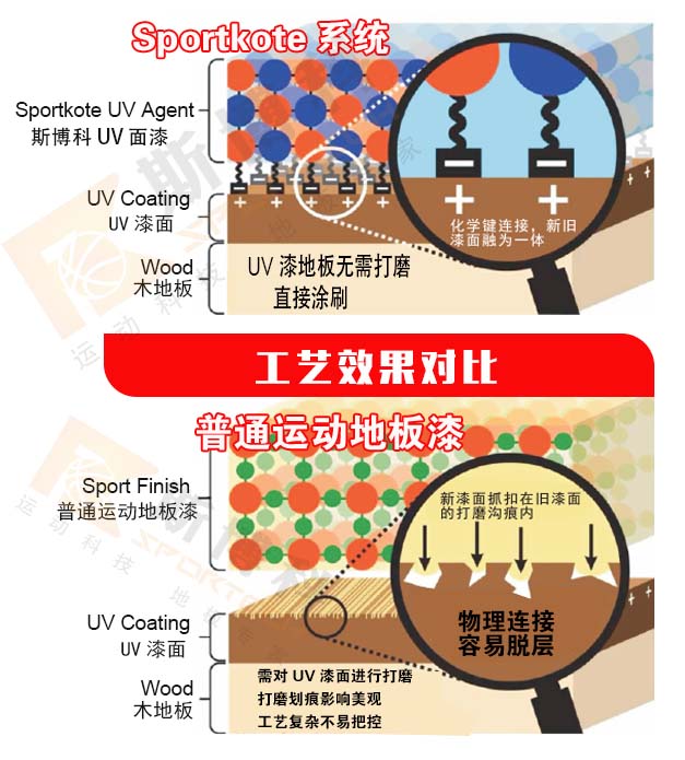 Sportkote UV Agent系列油漆,可直接涂刷在工廠預制UV漆地板上,超強附著不脫漆,耐磨防滑,快速解決UV漆地板彩漆、畫線及防滑問題